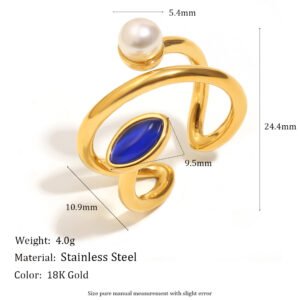 European and American cross-border retro, light luxury, high-end, stainless steel 18K gold-plated asymmetrical imitation pearl natural stone open ring.