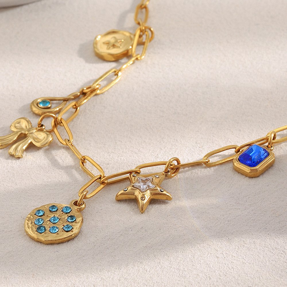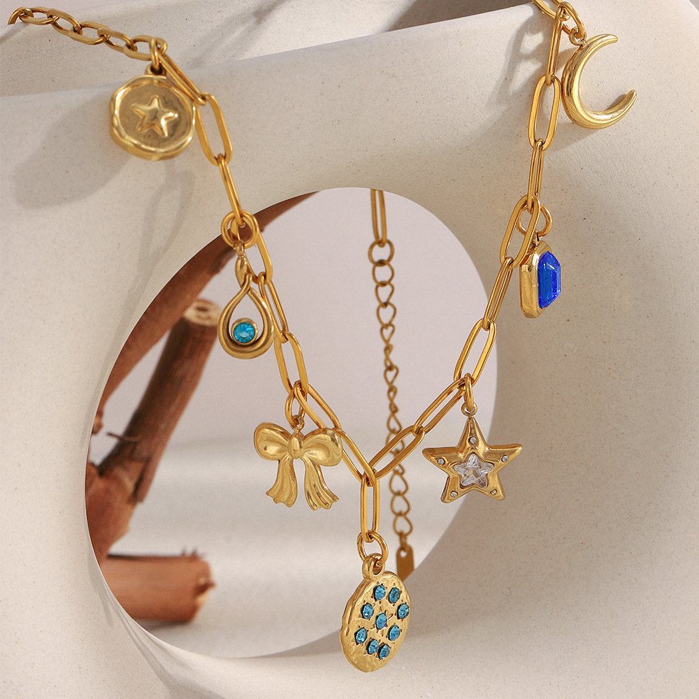 欧美时尚个性蓝色锆石星星项坠不锈钢镀18K金手工项链配饰女夏季