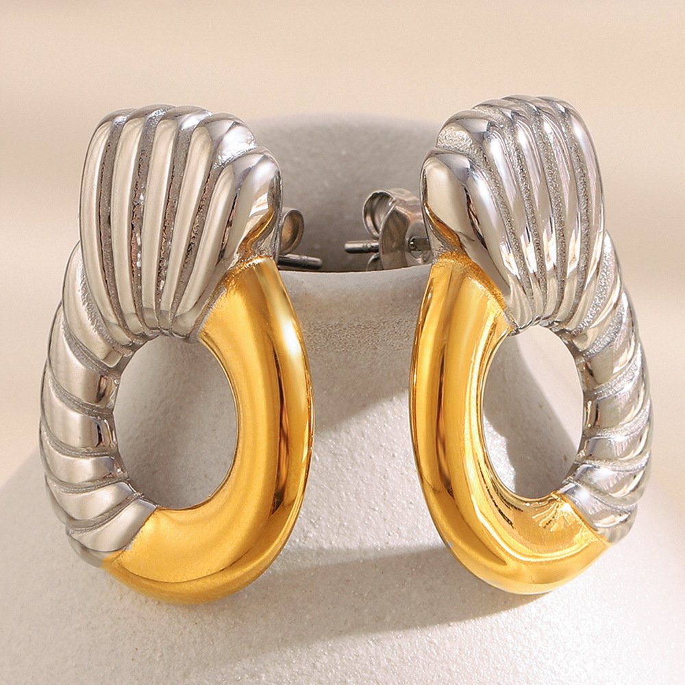欧美时尚气质小众设计款耳饰不锈钢镀18K金拼接斜纹圆环几何耳钉