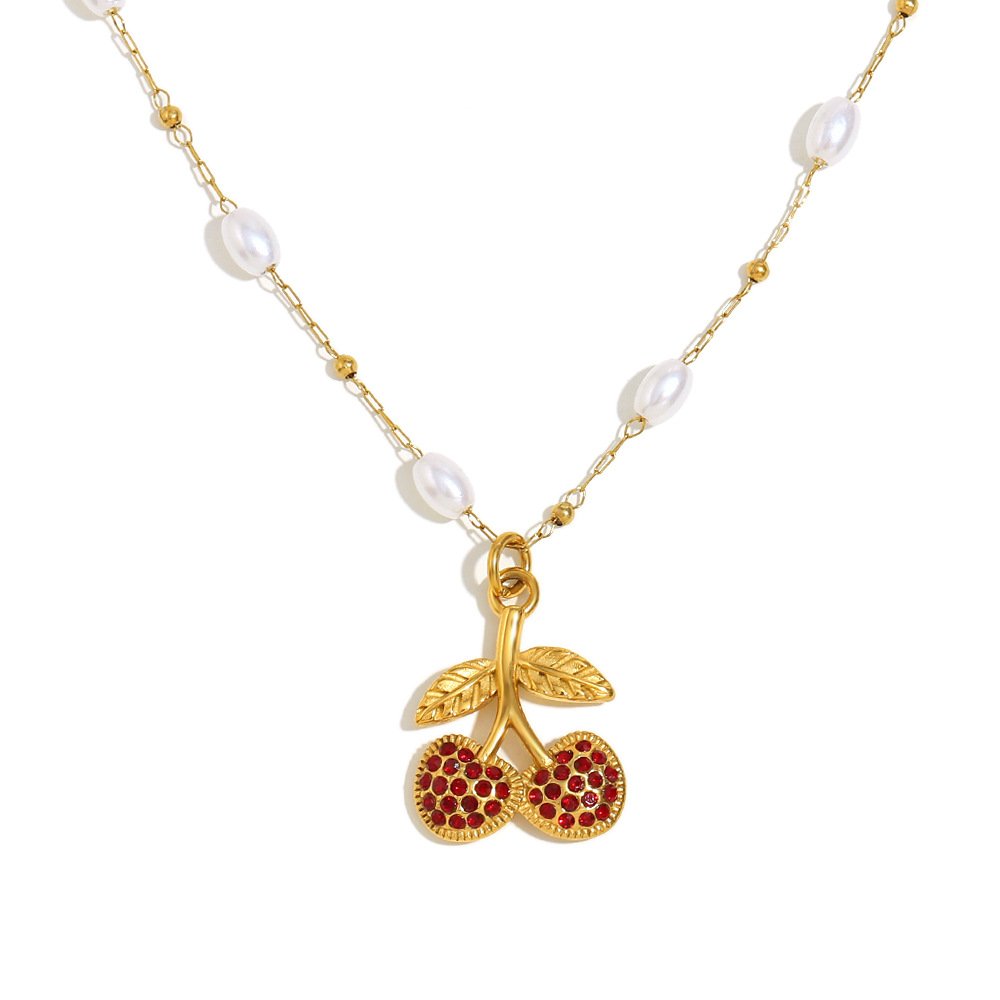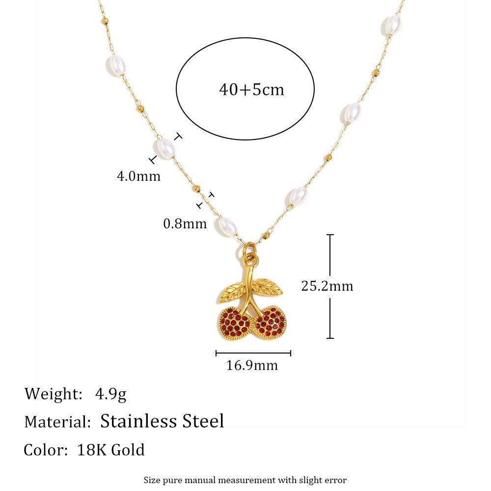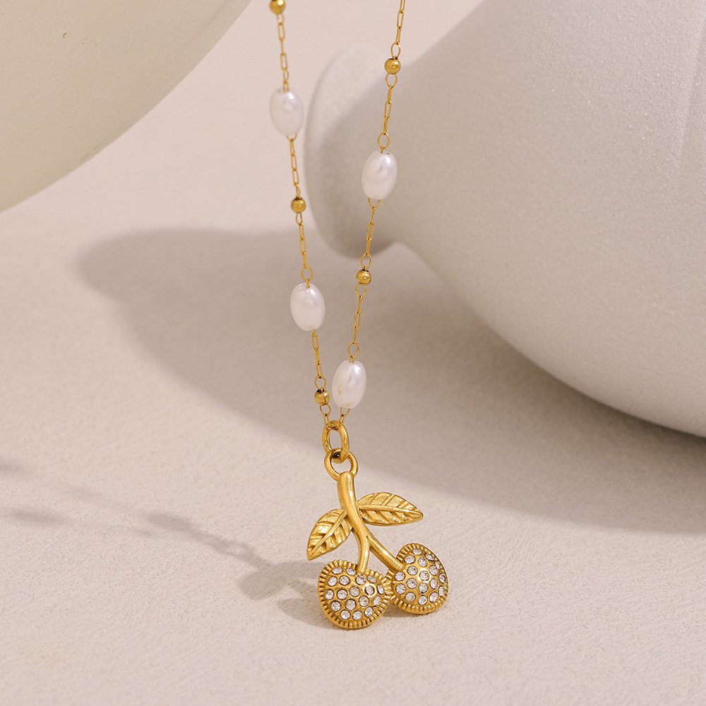 European and American cross-border elegant and sophisticated INS style, commuter-friendly stainless steel 18K gold-plated imitation pearl cherry pendant necklace for women.