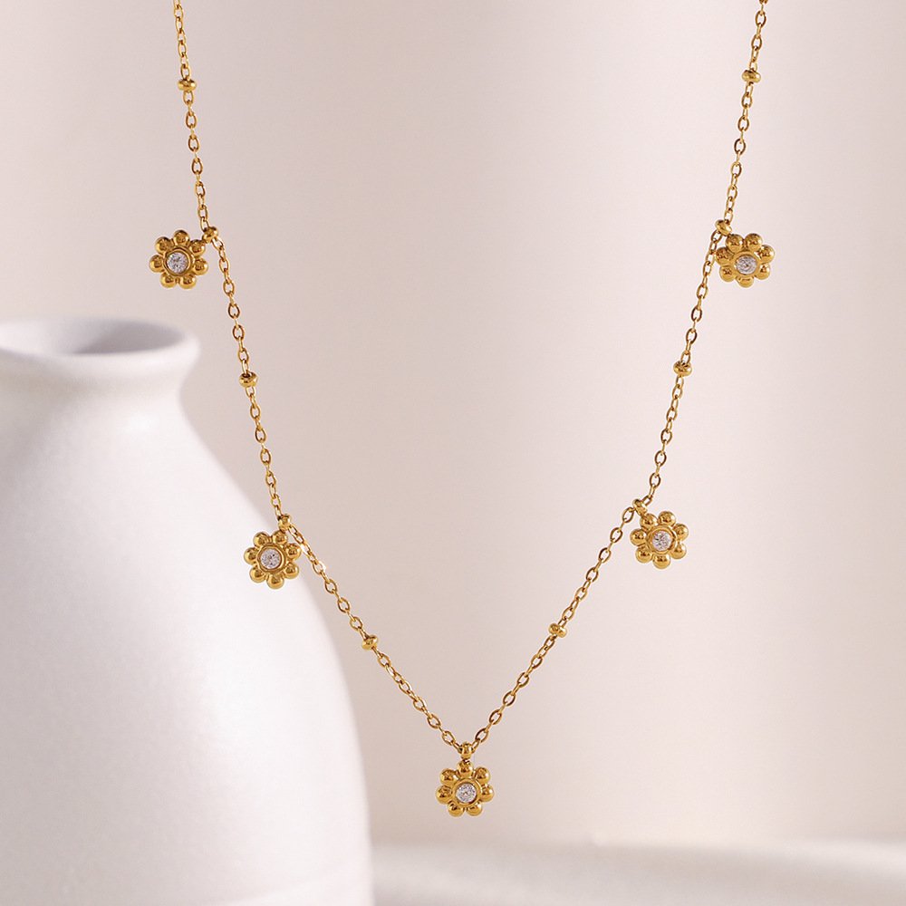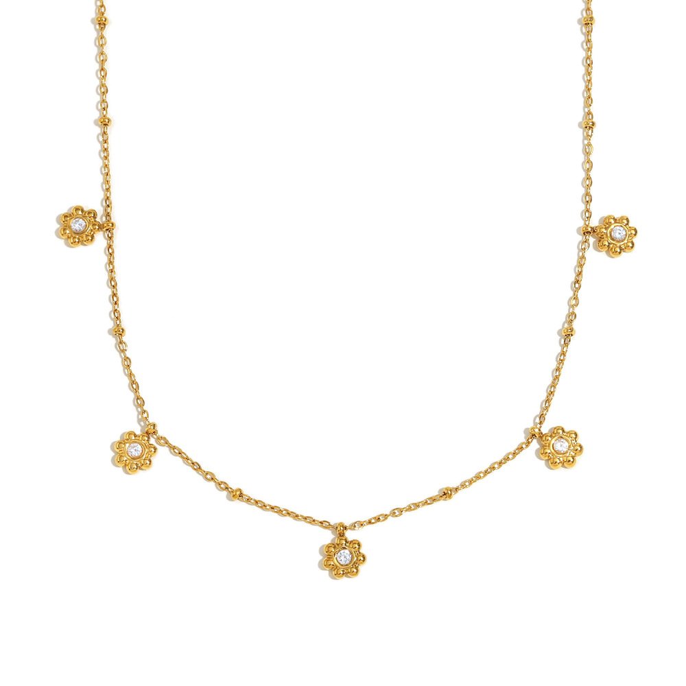 European and American Cross-Border Fashion Trend, Retro Exquisite Necklace, 18K Gold-Plated Stainless Steel Zircon Flower Beaded Necklace for Women