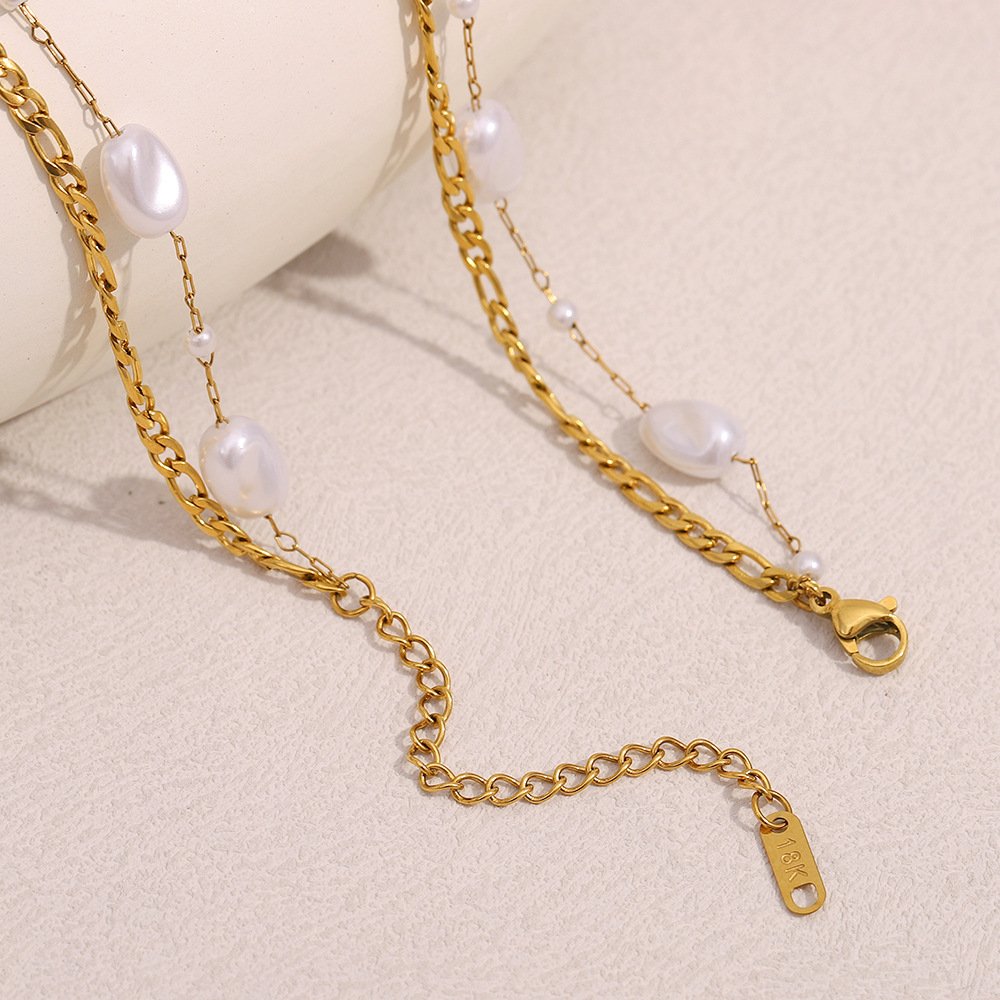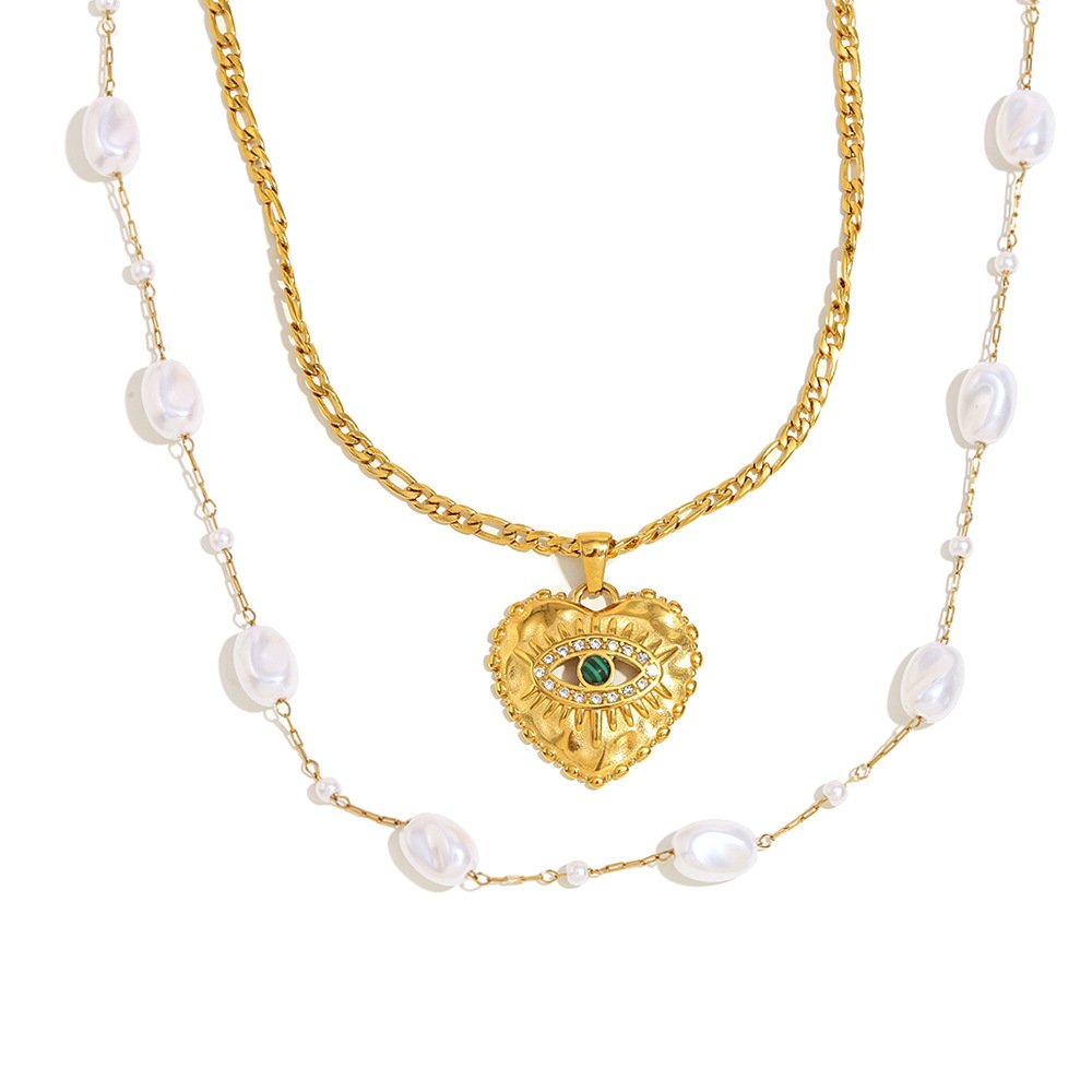 European and American cross-border fashionable and stylish personalized jewelry, stainless steel 18K gold-plated imitation pearl double-layer heart-shaped eye necklace.
