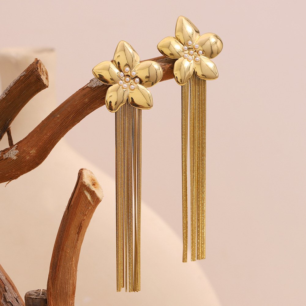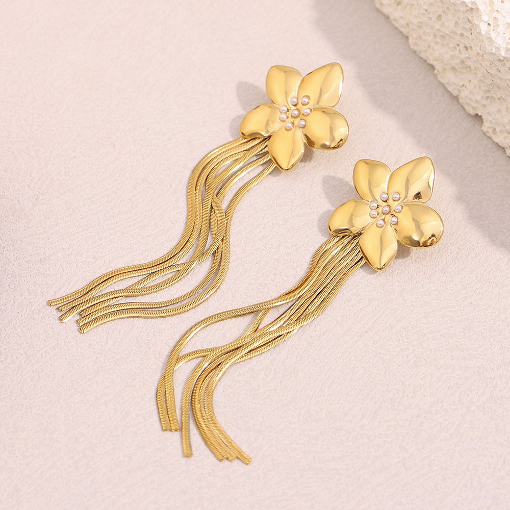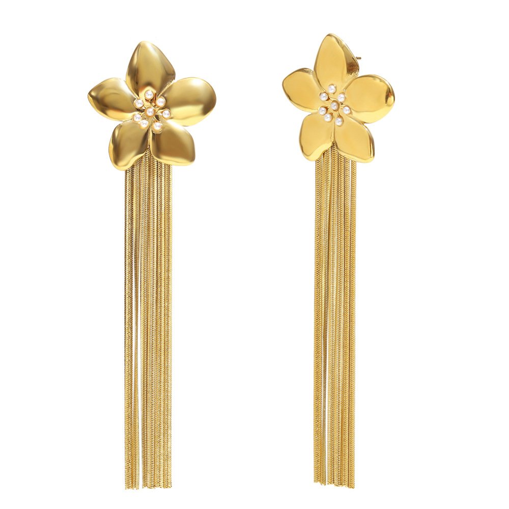 European and American cross-border hot-selling INS-style elegant and high-end earrings, stainless steel 18K gold-plated flower long tassel earrings.