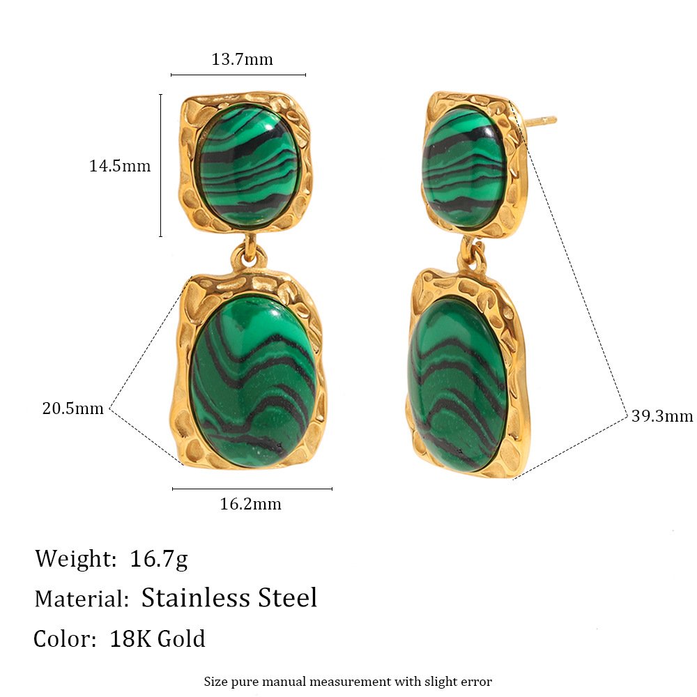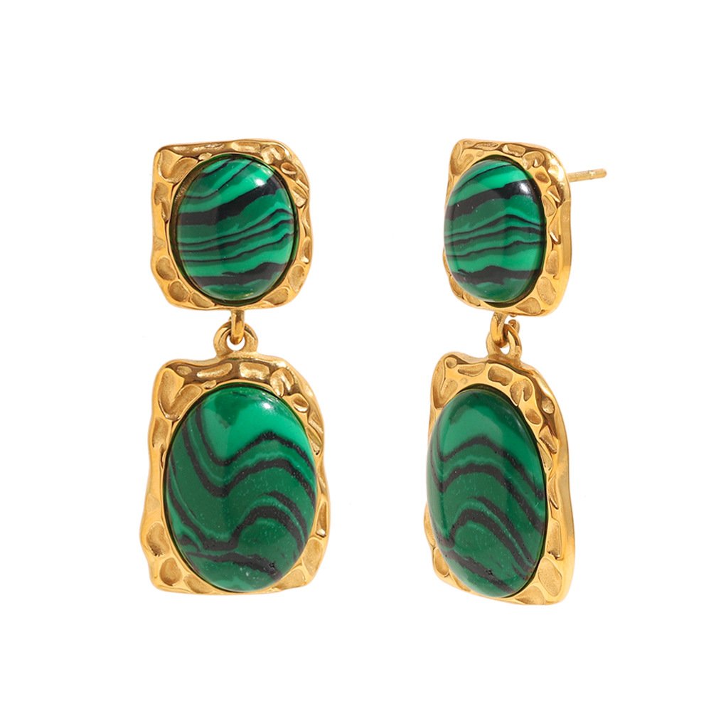 European and American cross-border hot-selling vintage, exaggerated, niche fashion earrings, 18K gold-plated stainless steel malachite pendant earrings
