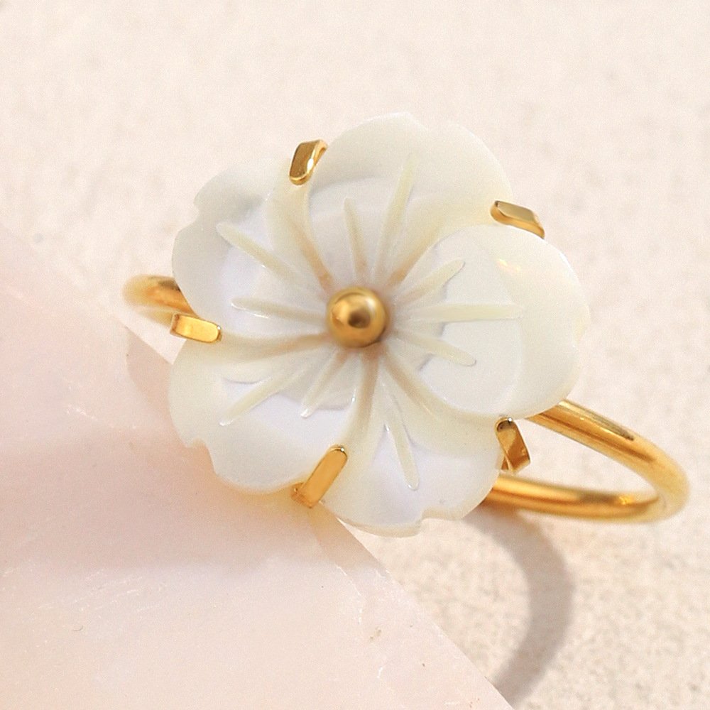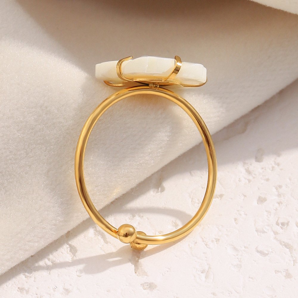 European and American cross-border INS style, French, exquisite and elegant hand jewelry 18K gold-plated stainless steel open-end ring for women with white shell flowers