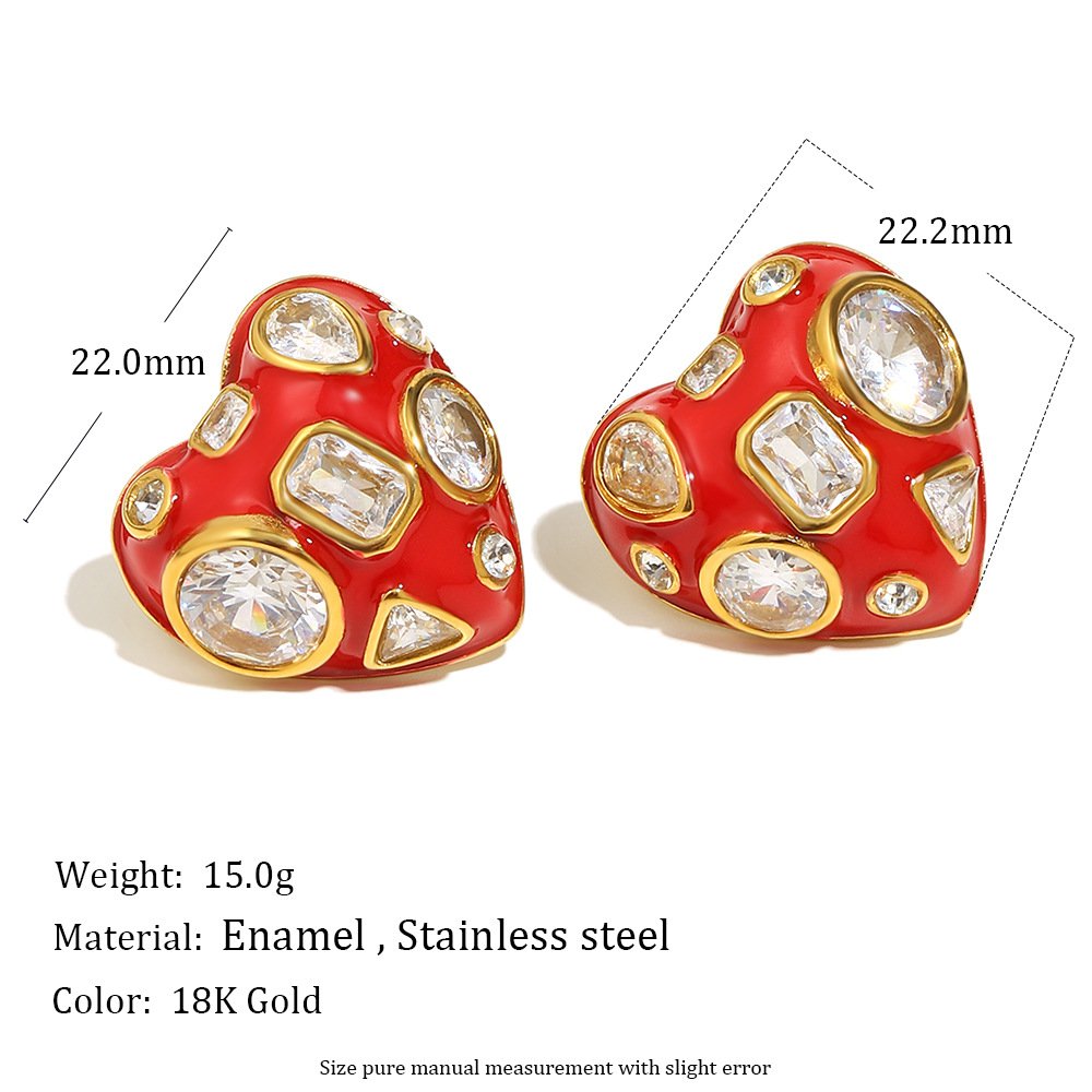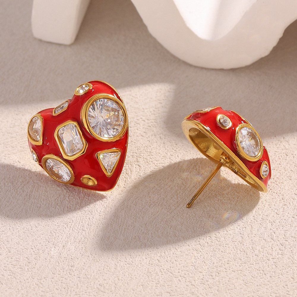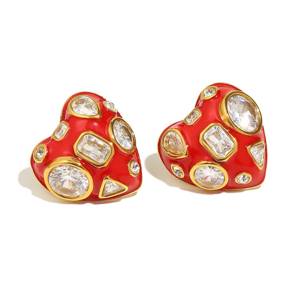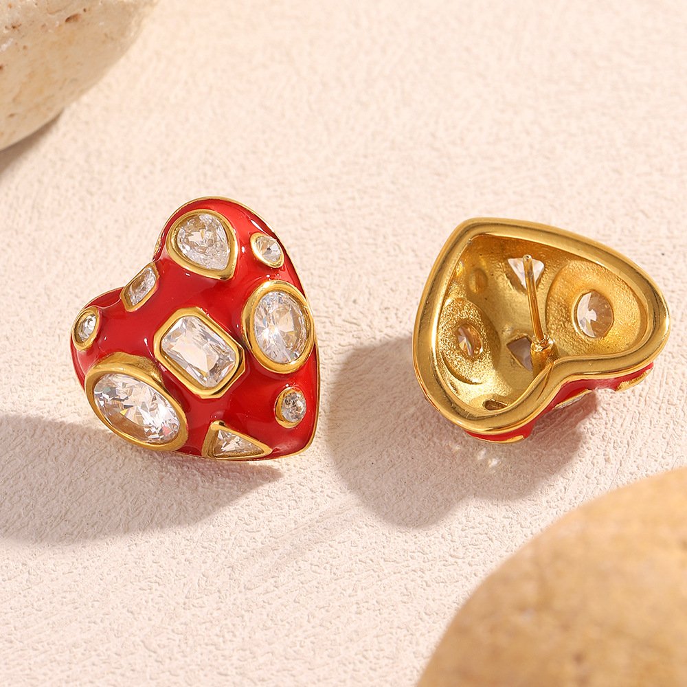 European and American cross-border INS style, stylish and trendy, 18K gold-plated stainless steel red drip heart and white zirconium stud earrings