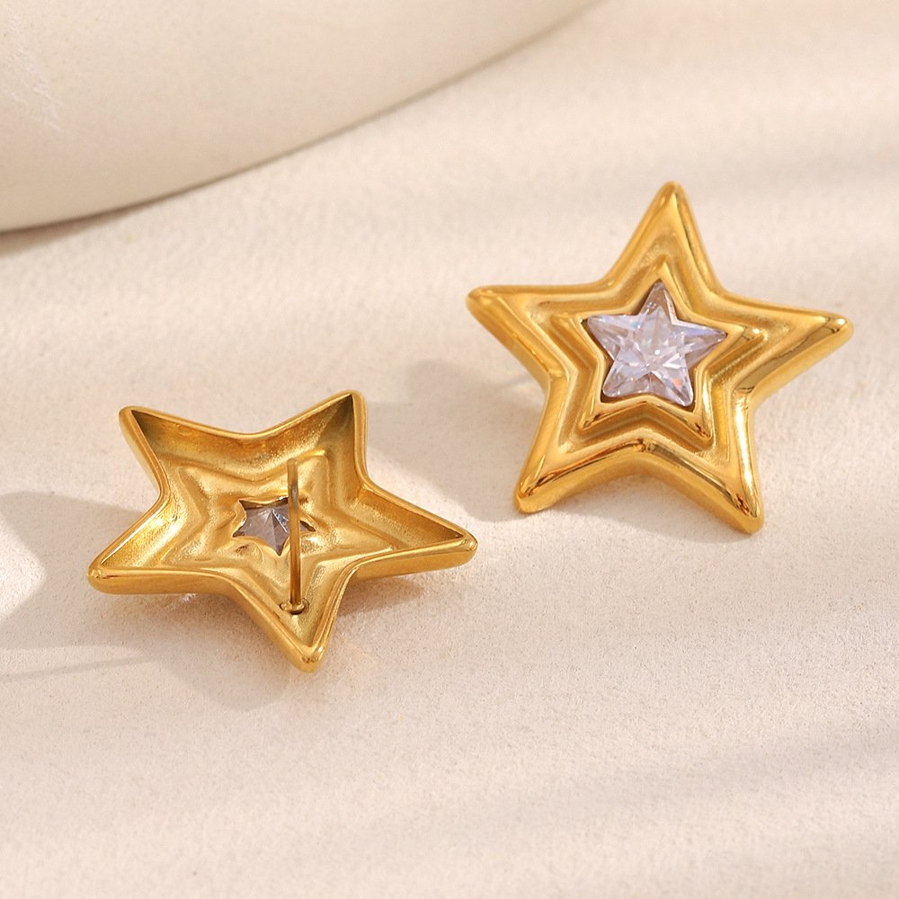 European and American cross-border INS style. Versatile, high-end, stainless steel 18K gold-plated five-pointed star zircon earrings.