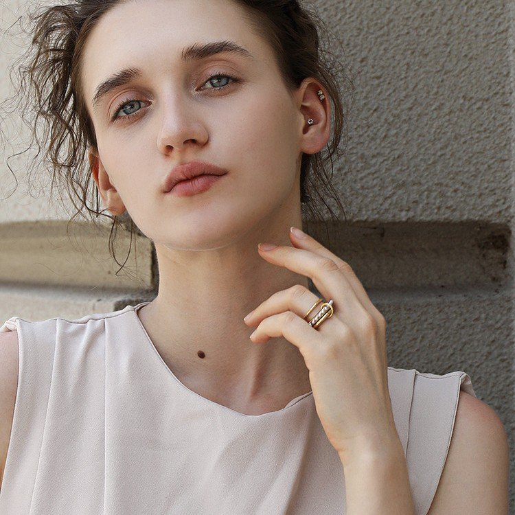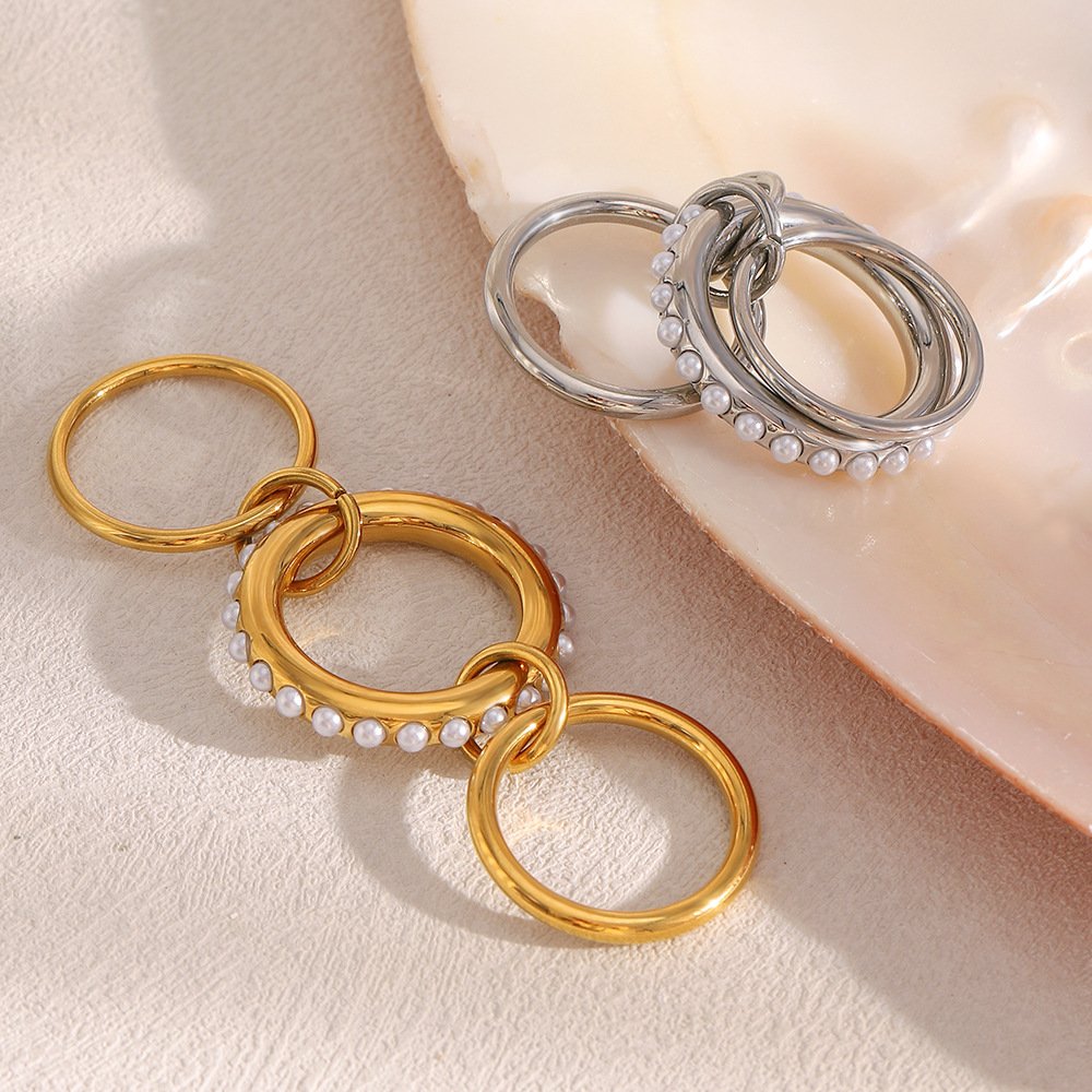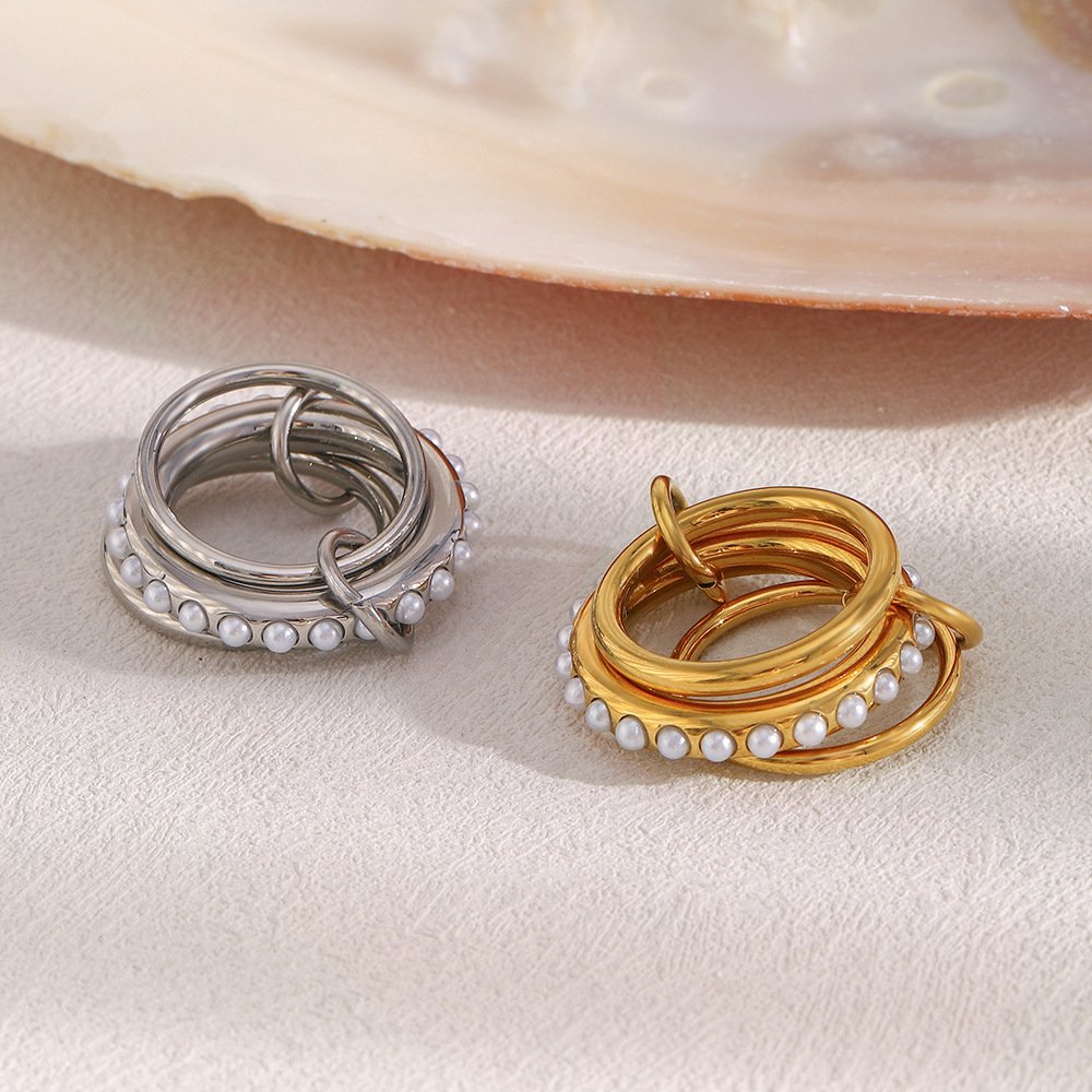 European and American cross-border INS style, versatile, simple hoop, elegant finger ring, stainless steel 18K gold-plated three-layer imitation pearl ring