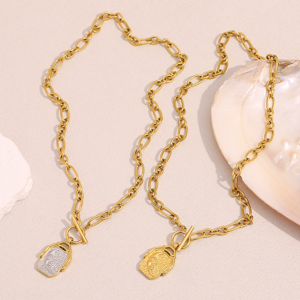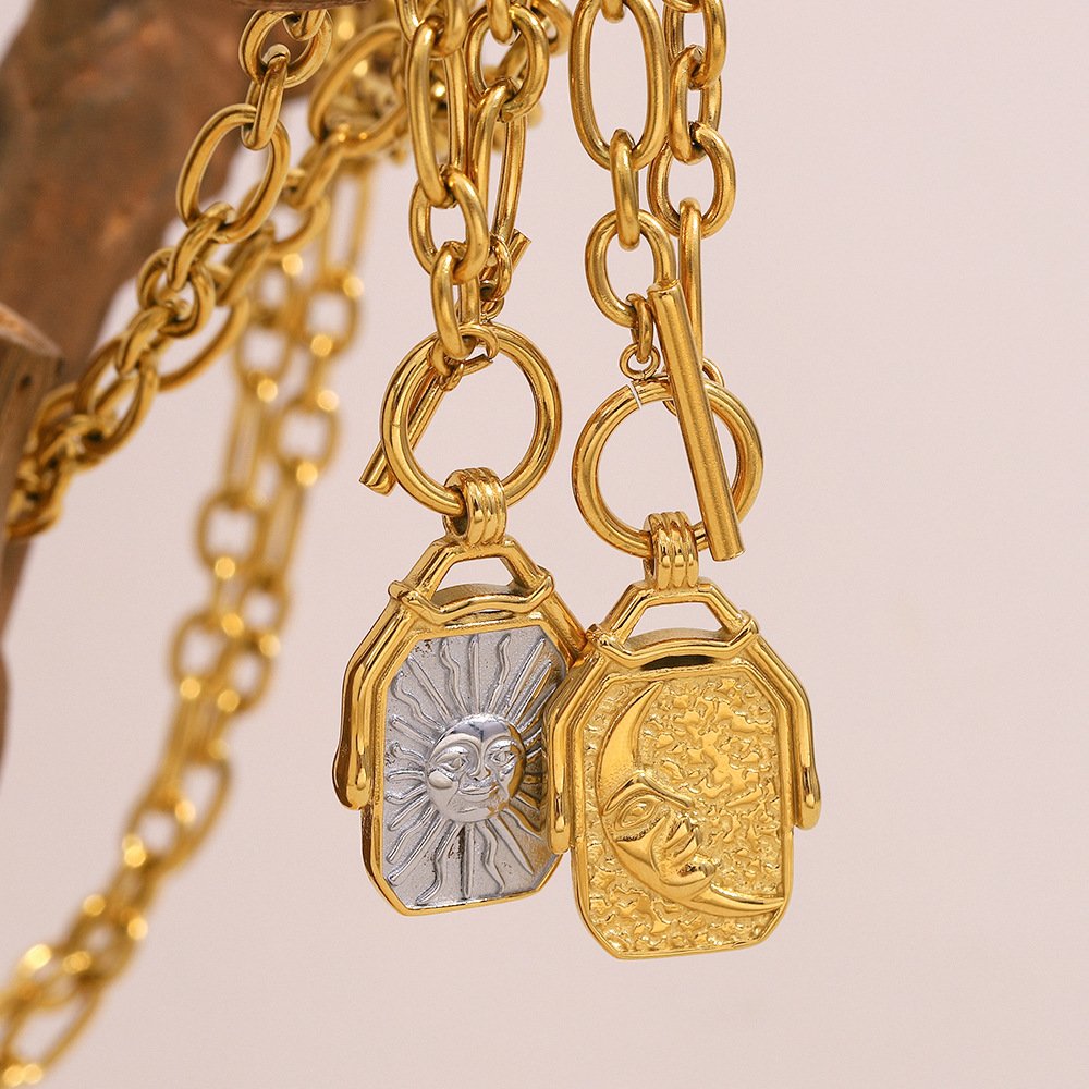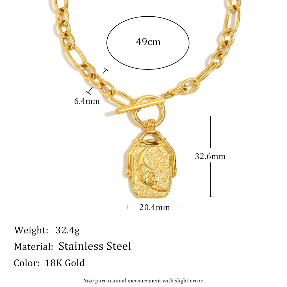 European and American cross-border new personalized light luxury vintage jewelry, stainless steel 18K gold-plated moon square pendant necklace for women.
