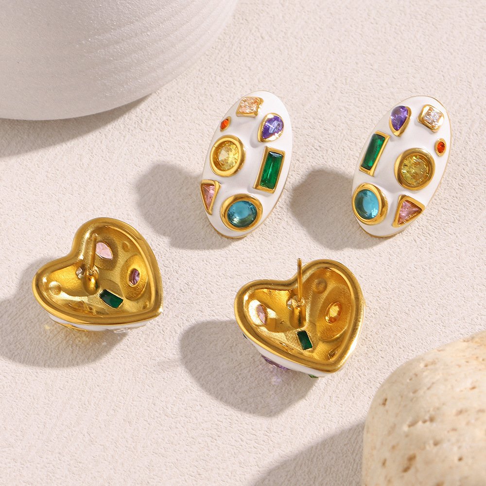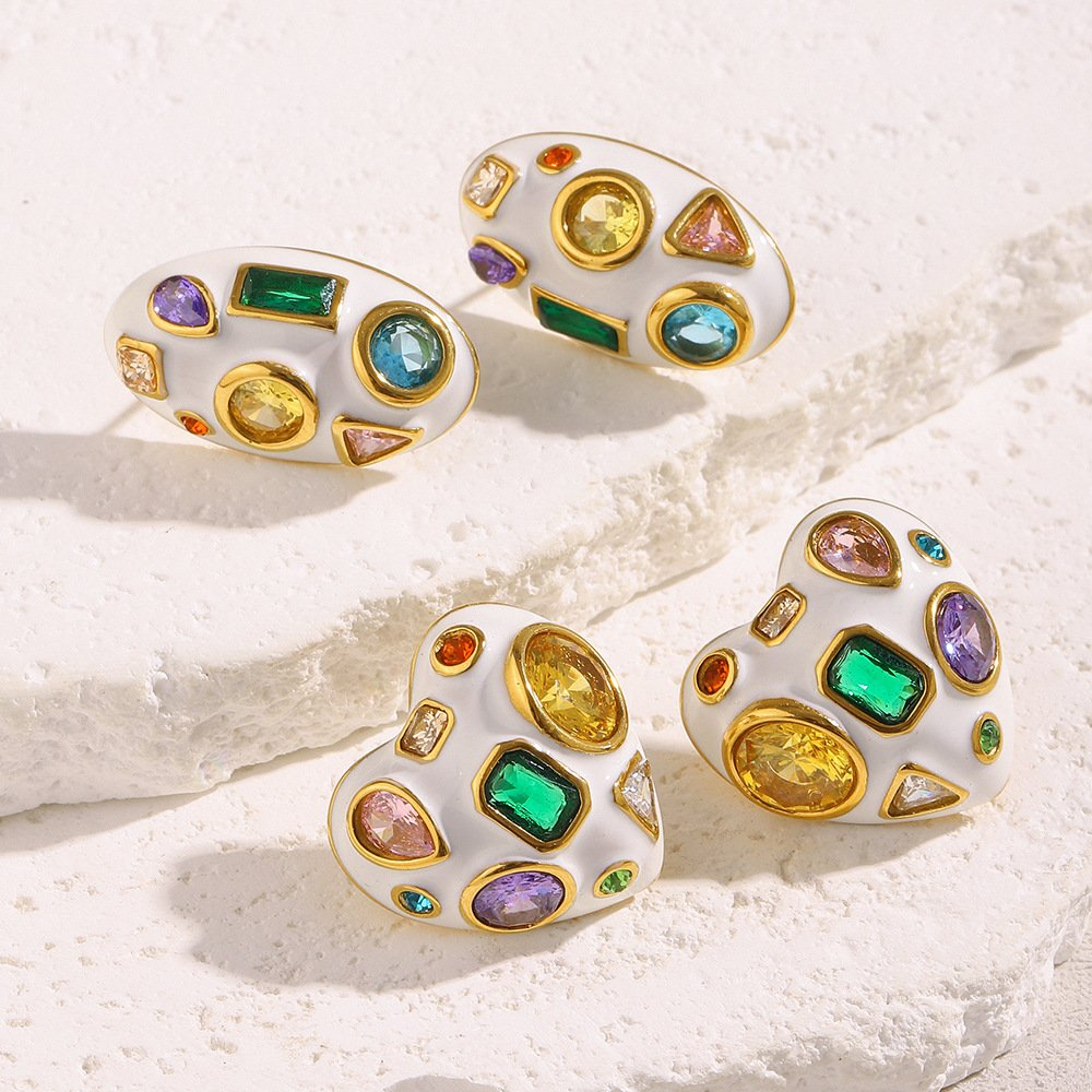 European and American cross-border new stylish and elegant stainless steel 18K gold-plated white oil-drip oval zirconium earrings for women
