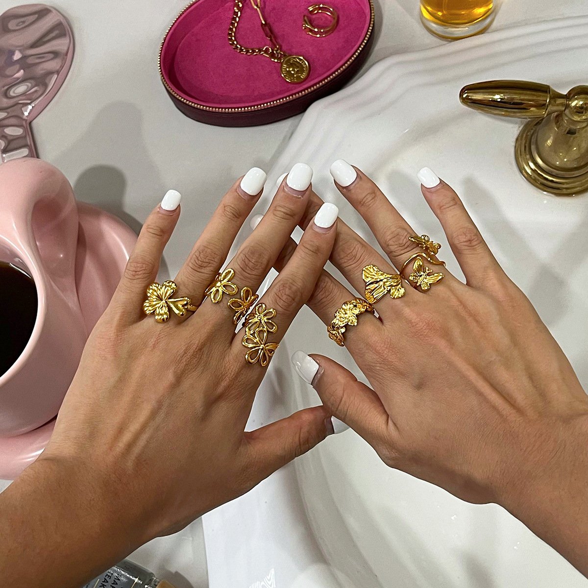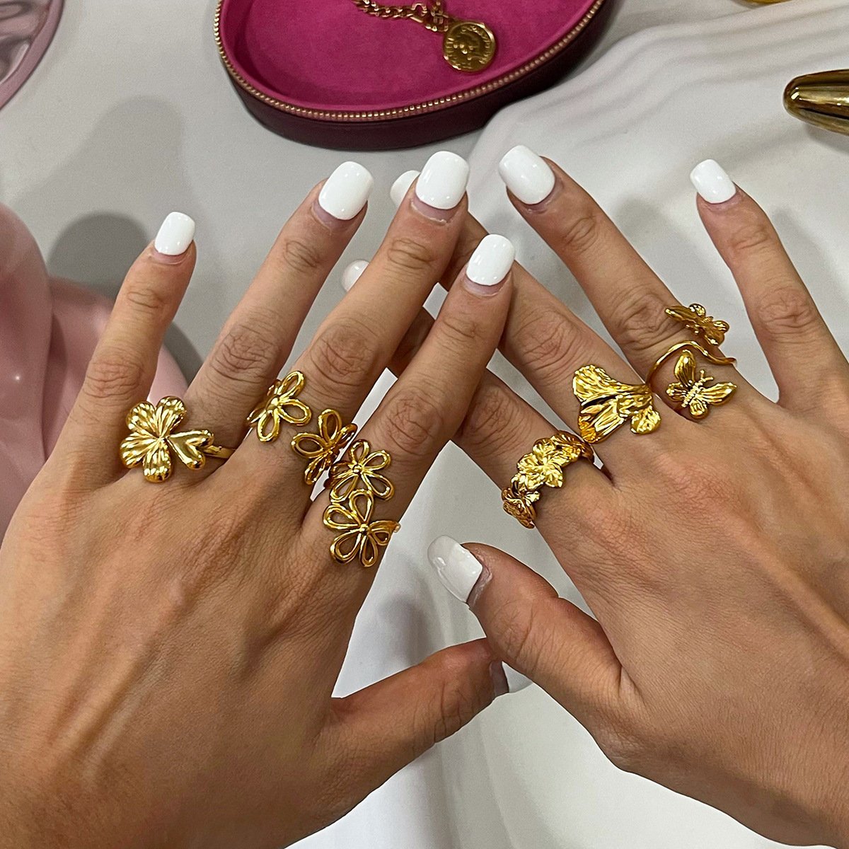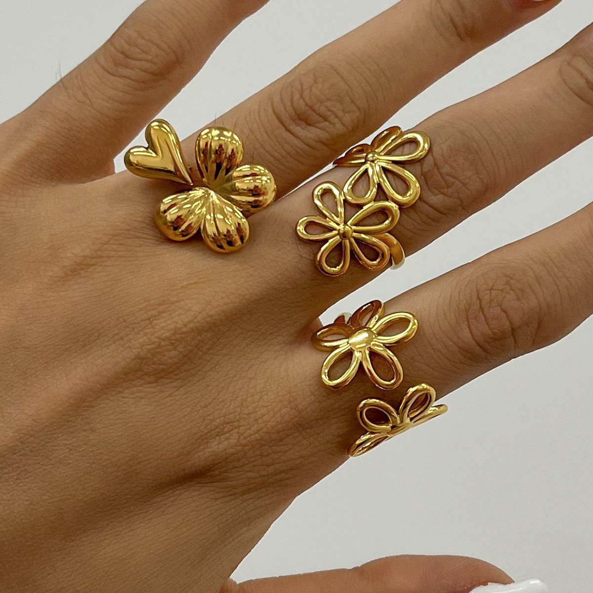 Jingqiao Design Sweet and Romantic 18K Gold Stainless Steel Hollow Line Flower Adjustable Open Ring Jewelry