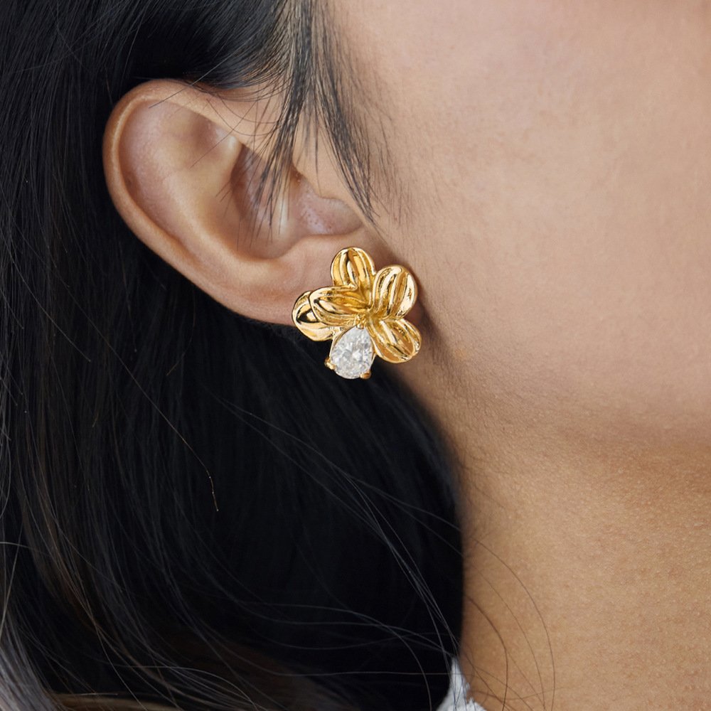 Jingqiao’s classic design: 16K gold and stainless steel teardrop-shaped white zircon flower earrings, wholesale.