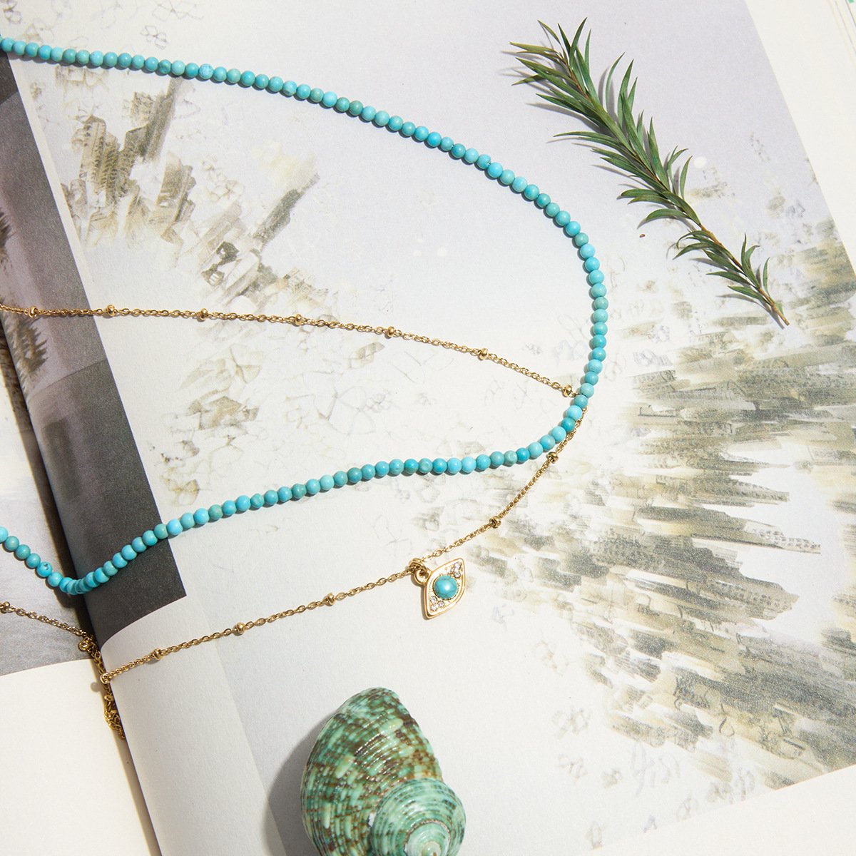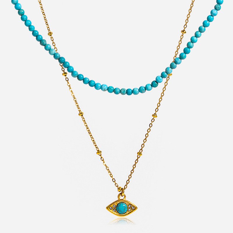 Jingqiao’s classic design, 18K gold and stainless steel double-layer necklace with blue turquoise, jewelry wholesale