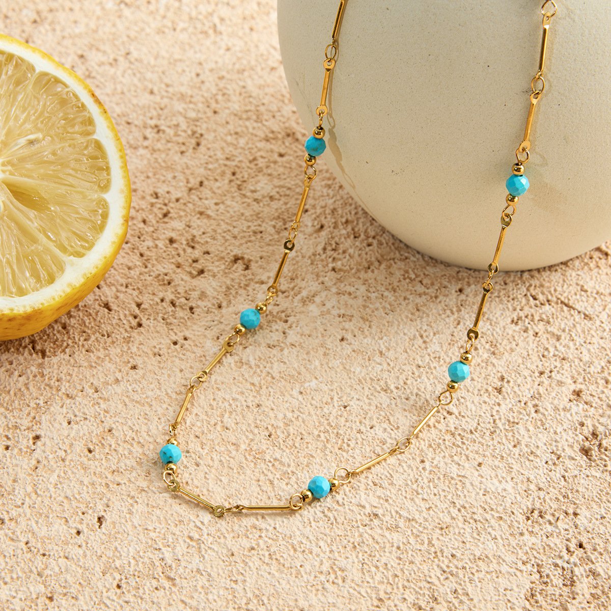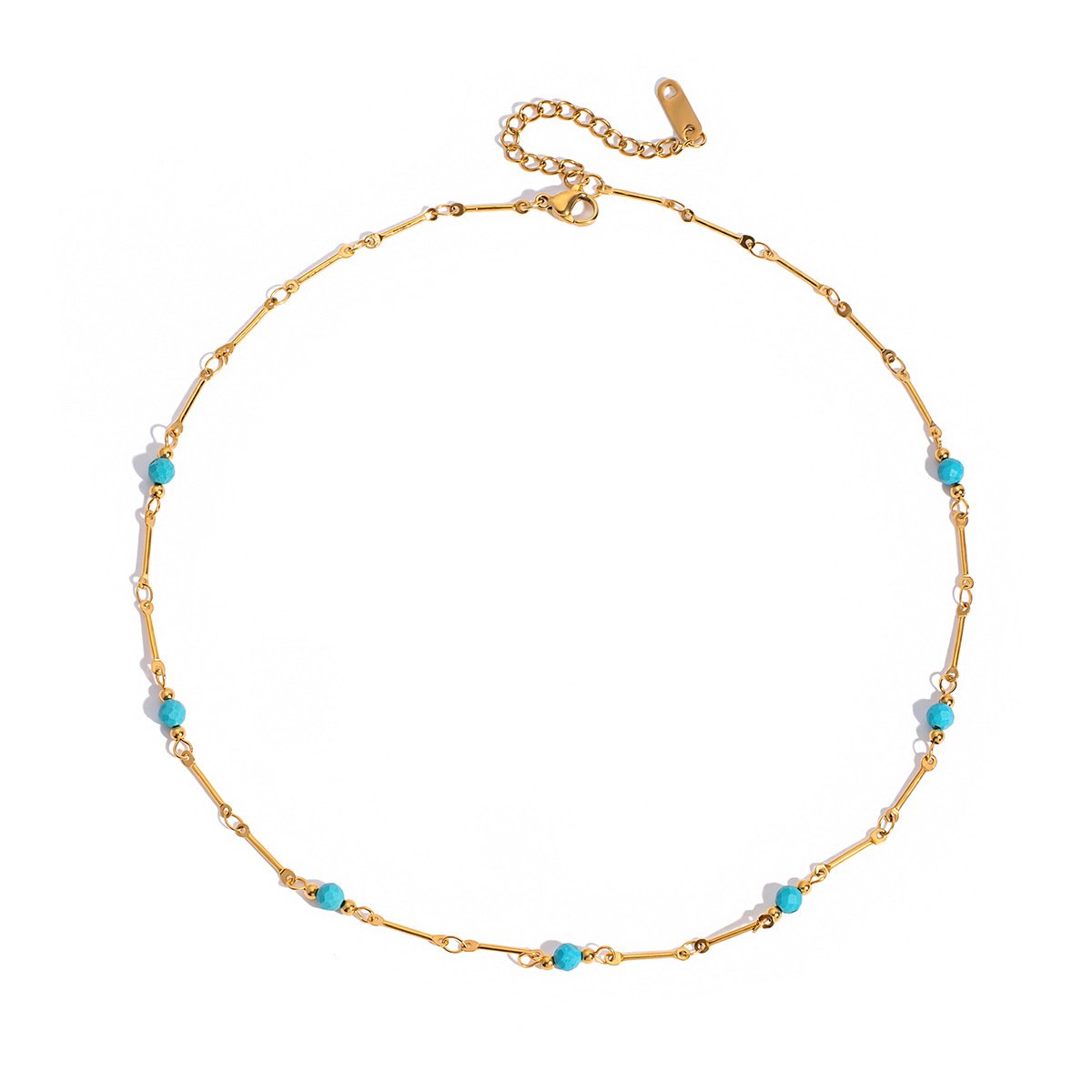 Jingqiao’s classic design: 18K gold and stainless steel round blue turquoise beaded bar chain and stainless steel necklace.