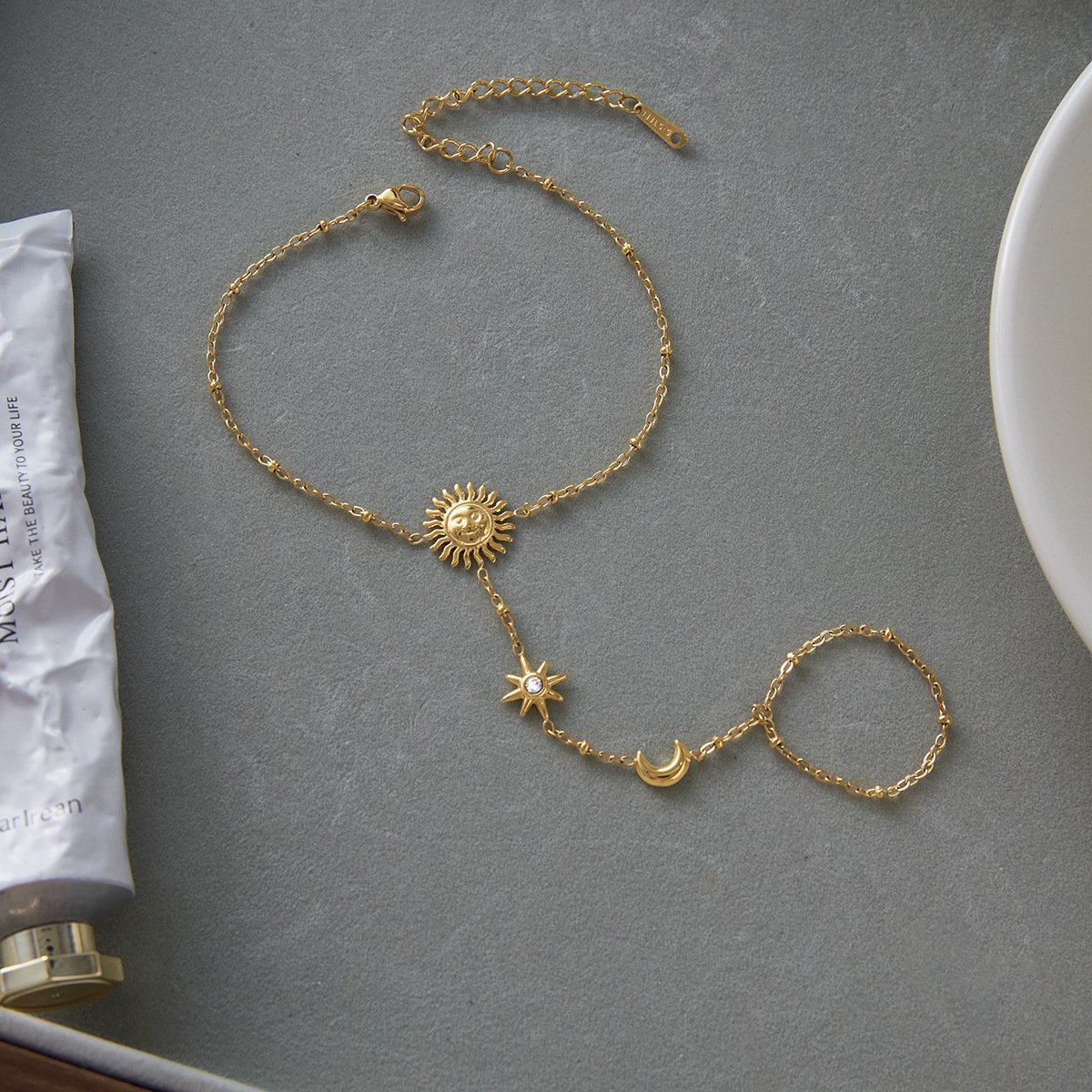 Jingqiao’s classic design, 18K gold stainless steel sun with diamonds, star and moon beaded chain bracelet.