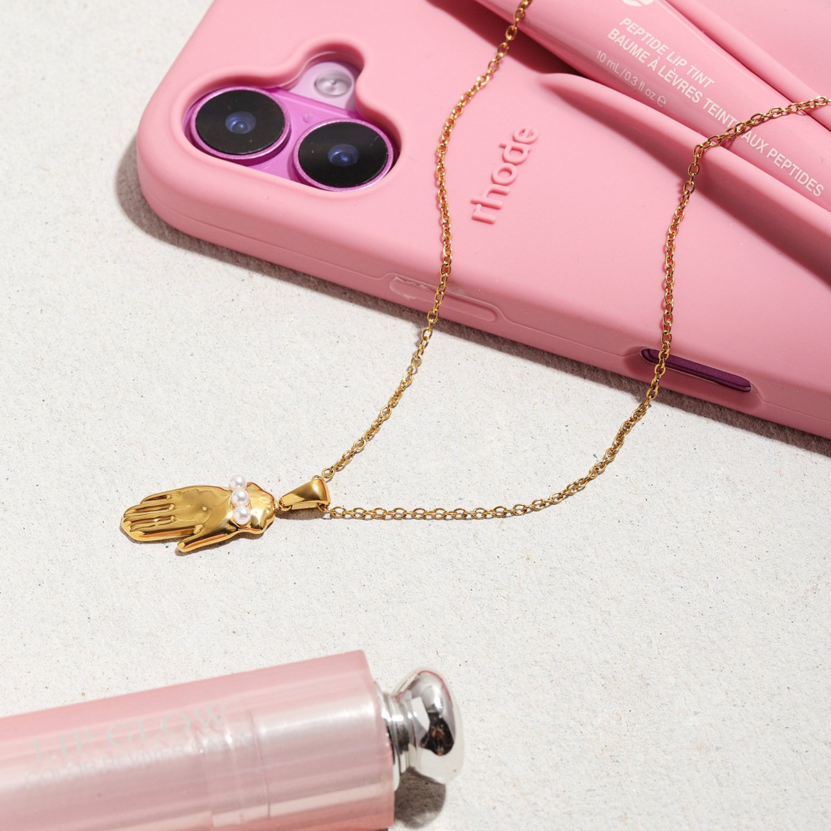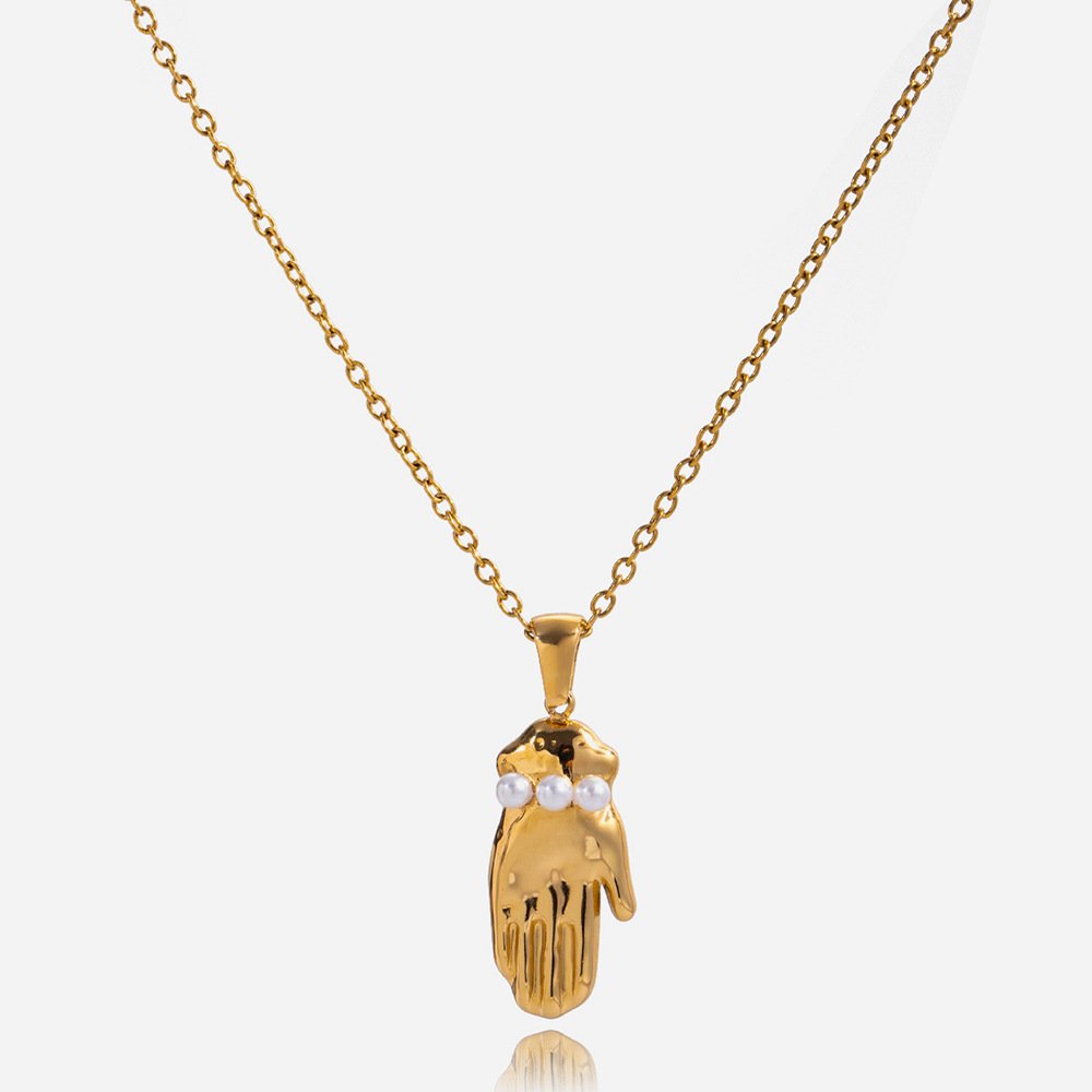Jingqiao’s European and American palm pearl necklace for women, 18K Stainless steel jewelry, light luxury, cross-border niche design.